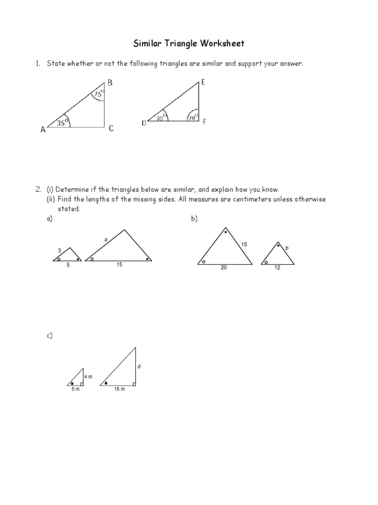 PDF Similar Triangle Worksheet - VDU Užsienio kalbų institutas Similar Triangle Worksheet 1. State whether or not the following triangles are similar and support your answer. 2. (i) Determine if the triangles below are similar, and explain how you know. (ii) Find the lengths of the missing sides. All measures are centimeters unless otherwise stated. a) b) 5 3 1 a 2 0 1 5 1 2 b c) d 4 m 5 m 15