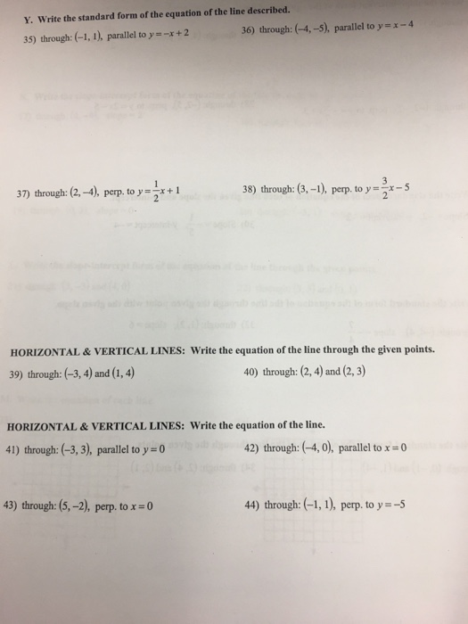 Equations of lines worksheet answers. PDF CSL Writing Equations of Lines Review - somerset.k12.ky.us Algebra 1 CSL Writing Equations of Lines Name_____ Writing Equations of Lines Review for Quiz Period____ ... hLBLvC0.M 7 pAdl2lj vraiKgnhXtIsH Mrhe6sQeNrGvFendE.H X 3MOaZdqeG twxijt BhE pISnLfsiGnSi3t4eO 3ANlEg0eBbvrKa1 x1z.n-5-Worksheet by Kuta Software LLC Answers to Writing Equations of Lines Review for Quiz 1) Standard Form Of Linear Equation Worksheet Answers Standard form for linear equations of a equation worksheets pre algebra functions graphing function line edboost lines in worksheet writing solved test 1 two variable chegg com review ws answers 2 wkst 3 5 7 slope intercept with printable pdf templateroller quadratic Standard Form For Linear Equations Standard Form Of A Linear Equation ... Writing Equations of Lines from Graphs Worksheets - Tutoringhour.com These pdf worksheets are most recommended for students in 8th grade and high school. CCSS: HSA-CED Equations of Lines from Graphs | Worksheet #1 To find the equation that the graph represents, observe the line, identify the y-intercept (b), and determine the slope (m). Then, rewrite the equation in the form y = mx + b. PDF Writing Linear Equations - Kuta Software Writing Linear Equations Date_____ Period____ Write the slope-intercept form of the equation of each line. 1) 3 x − 2y = −16 y = 3 2 x + 8 2) 13 x − 11 y = −12 y = 13 11 x + 12 11 ... Create your own worksheets like this one with Infinite Algebra 1. Free trial available at KutaSoftware.com. Title: Writing Linear Equations