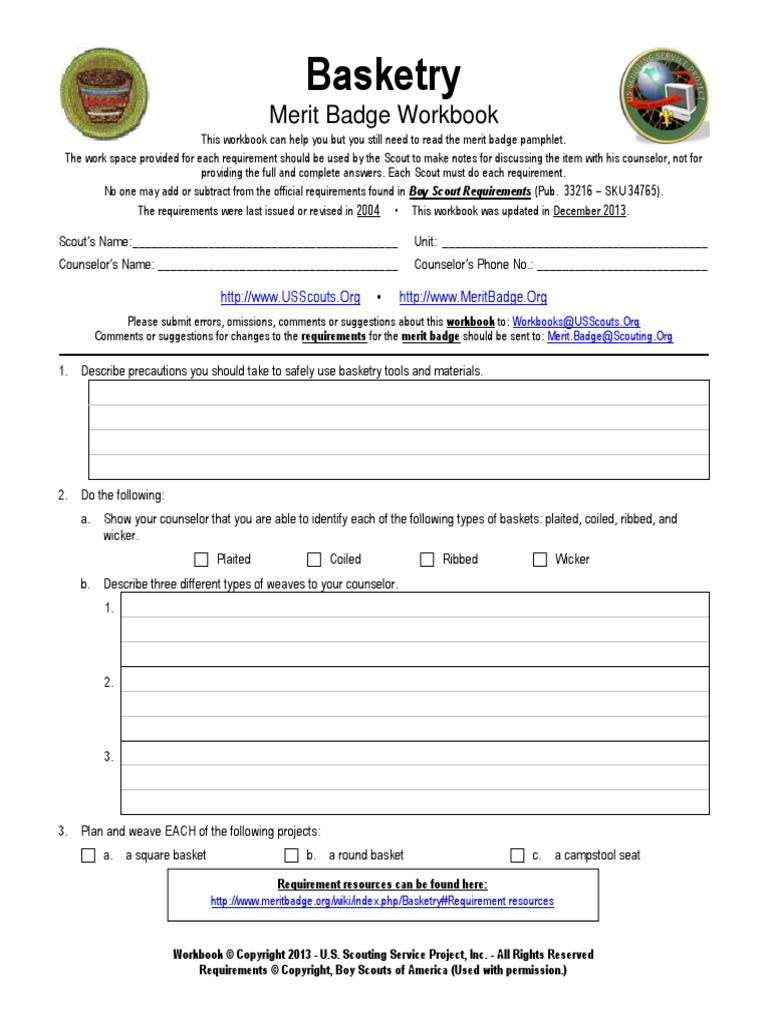 Merit Badge Worksheets - USSCOUTS.ORG 12/10/2022 · If a merit badge pamphlet is updated during the year, a Scout can choose to use either full set of old requirements or new requirements in the pamphlet. Those will show an effective date of the following year (i.e. a pamphlet issued in June of 2008 will say "2009 requirements"). Once the new year begins, all Scouts starting the merit badge must use the …