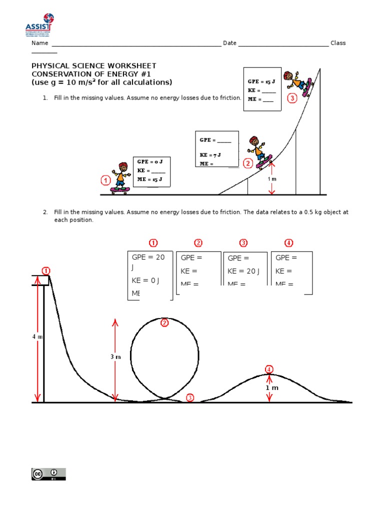 (PDF) Conservation of Energy Worksheet - Academia.edu Conservation of Energy Worksheet Name: ___________________ PE before + KE before = PE after + KE after PE = mgh KE = ½ mv2 g = 9.81 m/s2 3. A 100 kg roller coaster comes over the first hill at 2 m/sec (vo). The height of the first hill (h) is 20 meters. See roller diagram below.