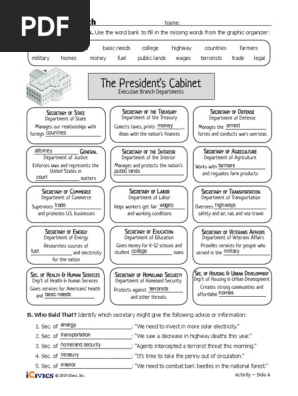 PDF A Very Big Branch - fhsboyd.weebly.com (F— The branch also includes many departments and agencies.) 2. Each government department has a leader called a secretary. (T) 3. The15departmentheadsare allpartofthe president'scabinet. (T) 4. Thepresident'scabinetisagroupofpeoplewhoguardthepresident. (F— The cabinet members advise the president.) 5. PDF A Very Big Branch - Azteach.com A Very Big Branch - Azteach.com worksheet on cabinet departments Civics worksheet a very big branch answers : journeytoberemembered. Presidential cabinet worksheet. Civics worksheet a very big branch answers : http www azteach com. Random Posts. timed addition and subtraction worksheets; trace lines preschool worksheet; worksheet oxidation numbers; A Very Big Branch Flashcards | Quizlet Who is the head of the executive branch? The president What is the largest branch of our government? The executive branch What is the executive branch made up of? Departments and independent agencies What are departments? The main organizations in the executive branch How many departments are there? 15 Who appoints the secretary of each department?
