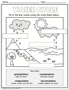 water cycle fill in the blank - TeachersPayTeachers Water Cycle Fill in the Blank Diagram Note Sheet by Pink Science Teacher 5.0 (1) $1.25 PDF Increase student engagement with this water cycle note sheet! Students can fill in the blanks and then add color. This product includes a full size sheet and half sheet option which makes this perfect for interactive science notebooks!