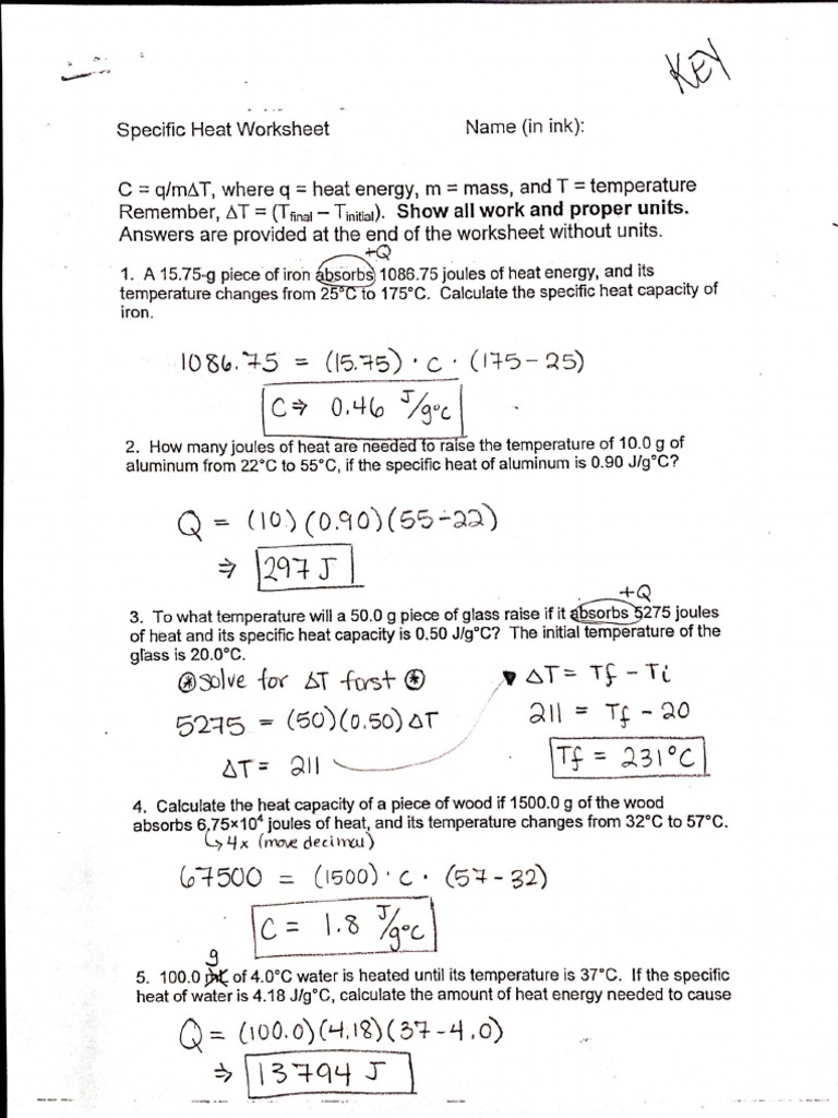 Specific Heat Calculations Worksheet Answers - qstion.co Specific heat calculations worksheet answers. A 15 75 g piece of iron sorbs 1086 75 joules of. Chemistry temperature amp specificheat worksheet answer key. 100 0 g of 4 0 c water is heated until its temperature is 37 c. Specific heat worksheet 1 answer key. Specific heat capacity worksheet with answers. C q mat where q heat energy m mass and t.