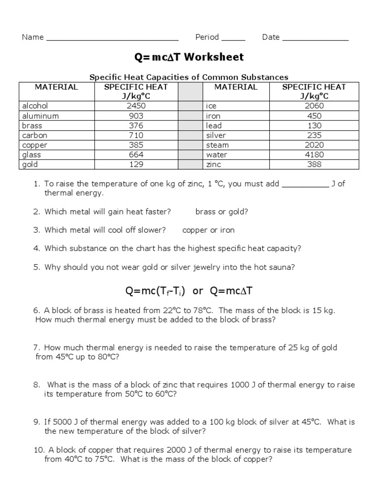 Calculating Specific Heat Extra Practice Worksheet - TSFX changes from 25°C to 175°C. Calculate the specific heat capacity of iron. ... Answers. Q = mc∆T, where Q = heat energy, m = mass, and ∆T = change in temp. 1. A 15.75-g piece of iron absorbs 1086.75 joules of heat energy ... Calculate the specific heat capacity of iron. 2. How many joules of heat are needed to raise the temperature of 10.0 g of aluminum from 22°C to 55°C, if the. Specific Heat Worksheet A 15.75-g piece of iron absorbs 1086.75 joules of heat energy, and its temperature changes from 25°C to 175°C. Calculate the specific heat capacity of iron.