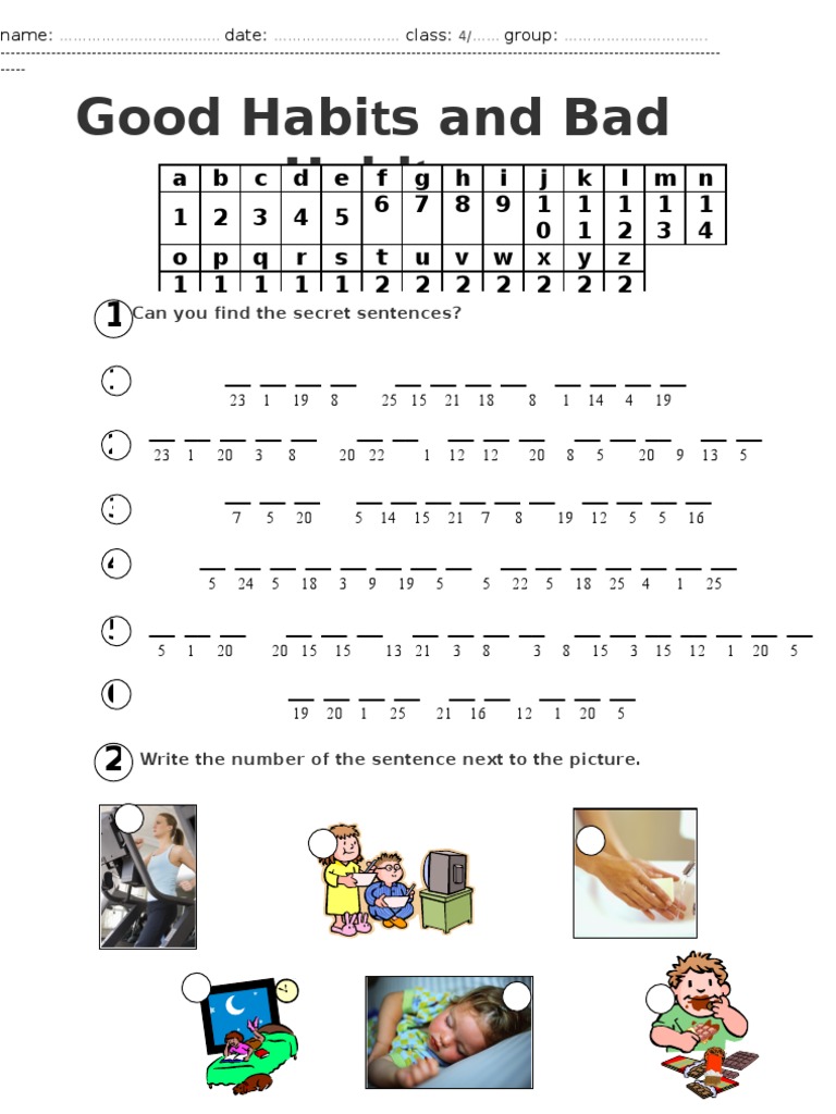 Good Habits and Bad Habits - Liveworksheets Live worksheets > English > English as a Second Language (ESL) > Healthy Habits > Good Habits and Bad Habits. Good Habits and Bad Habits. Matching tasks - ClassBook, p.45. Oman Curriculum. ID: 2840621. Language: English. School subject: English as a Second Language (ESL) Grade/level: grade 4. Age: 8-12. Bad Habits Vs Good Habits Worksheets - K12 Workbook Bad Habits Vs Good Habits Displaying all worksheets related to - Bad Habits Vs Good Habits . Worksheets are Breaking bad habits work, Step 1 identify your current habits, Table of contents, Healthy habits that promote wellness, Healthy 9sleep haits, 2019 nutrition work, And life skills workbook teen friendship workbook, Behavior change theories and techniques.