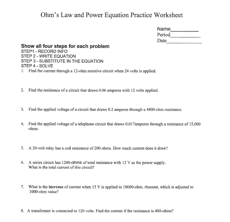 Ohm's law worksheet answers. Ohm’s Law - How Voltage, Current, and Resistance Relate Ohm’s Law Triangle Technique. Ohm’s Law is a very simple and useful tool for analyzing electric circuits. It is used so often in the study of electricity and electronics that it needs to be committed to memory by the serious student. Circuit Construction Kit: DC - Series Circuit - PhET Experiment with an electronics kit! Build circuits with batteries, resistors, ideal and non-Ohmic light bulbs, fuses, and switches. Determine if everyday objects are conductors or insulators, and take measurements with an ammeter and voltmeter. View the circuit as a schematic diagram, or switch to a lifelike view. Ohm's Law Practice Worksheet With Answers [PDF Download ... Aug 30, 2019 · He finally published the law in 1827 and generalized his observations in single statement: The current flowing through the resistor is directly proportional to the voltage applied across it. The website is a dedicated resource for Ohm’s law, calculation tools, applications and theoretical calculations on Ohm’s law. Home | ExploreLearning Solve the math fact fluency problem. Adaptive and individualized, Reflex is the most effective and fun system for mastering basic facts in addition, subtraction, multiplication and division for grades 2+.