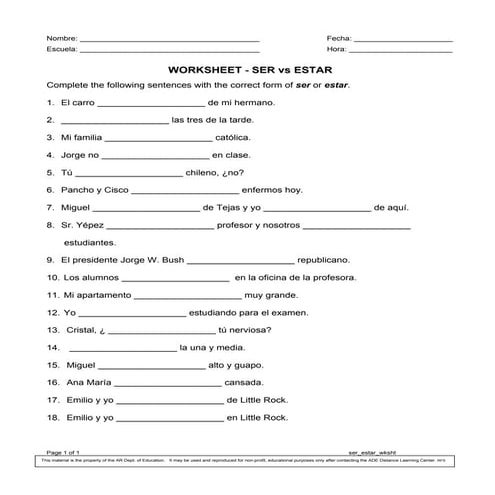 ser and estar worksheets with keys - TeachersPayTeachers There are a total of 30 uses of ser and estar to see in context.~A worksheet with 10 questions based on the reading and a short writing section. ~The same reading with blanks that students must complete with either ser and estar.~Answer keyLevel: Spanish 1+Activity idea: Have students translate the paragraphs alone or in small groups and then ... Worksheet 2.9 Ser And Estar Answer Key - myilibrary.org Worksheet 2.9 Ser And Estar Answer Key | added by users 2802 kb/s 10465 Gramatica C The Verb Estar Answer - PDF Free Download Maite es/? est inteligente/since This PDF book include gramatica c ser and estar answer key information. To download free spanish-speaking children do not ... Ser O Estar Answer Key Worksheets - Learny Kids Ser O Estar Answer Key Displaying top 8 worksheets found for - Ser O Estar Answer Key. Some of the worksheets for this concept are Verbs ser or estar, The verbs to know ser estar, A unit on ser versus estar the two spanish verbs that, Ser estar, I am, Spanish4teachers, El verbo ser. Found worksheet you are looking for?