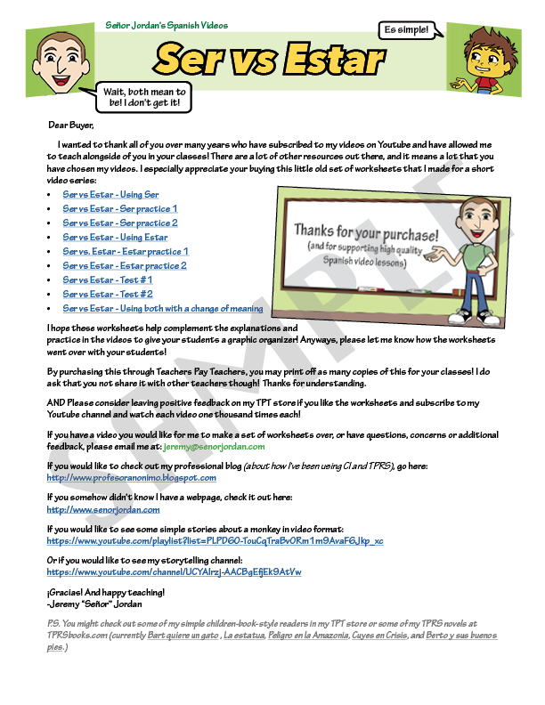 ser and estar worksheets with keys - TeachersPayTeachers There are a total of 30 uses of ser and estar to see in context.~A worksheet with 10 questions based on the reading and a short writing section. ~The same reading with blanks that students must complete with either ser and estar.~Answer keyLevel: Spanish 1+Activity idea: Have students translate the paragraphs alone or in small groups and then ...