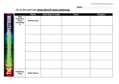 Electromagnetic Spectrum activity - Liveworksheets Live worksheets > English > Science > Physics > Electromagnetic Spectrum. Electromagnetic Spectrum. Asses the student knowledge about electromagnetic spectrum [properties and uses] ID: 1502950. Language: English. School subject: Science. Grade/level: 7. Age: 11-13. Main content: Physics.