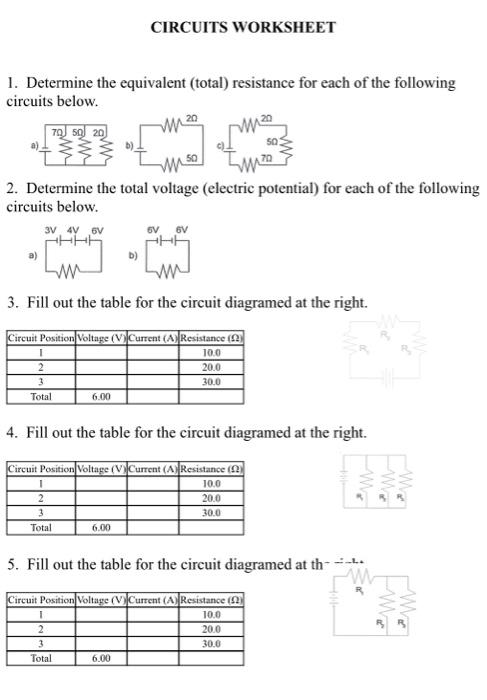 PDF Circuits Worksheet - Wpmu Dev CIRCUITS WORKSHEET 1. Determine the equivalent (total) resistance for each of the following circuits below. 2. Determine the total voltage (electric potential) for each of the following circuits below. 3. Fill out the table for the circuit diagramed at the right. Circuit Position Voltage (V) Current (A) Resistance (Ω) 1 10.0 2 20.0