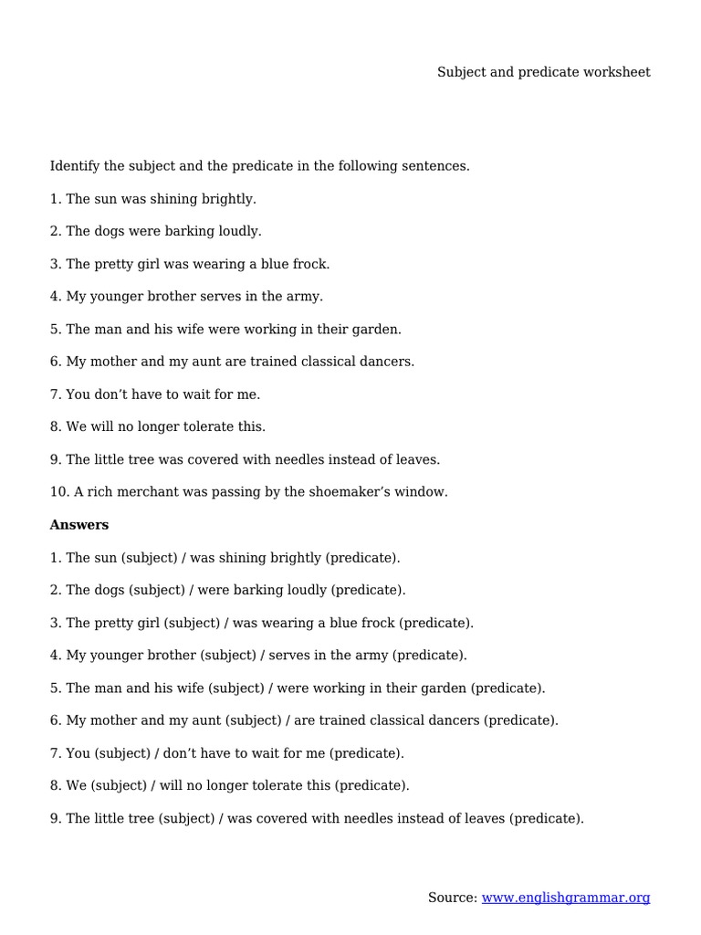 Subject and Predicate Practice | Worksheet | Education.com This printable grammar worksheet offers 10 sentences for students to identify the subject and predicate. Popular searches: Reading , Money , Fractions , Sight Words , Multiplication Activity types Subjects and predicates worksheets - K5 Learning A sentence can be considered to have two parts: a subject and a predicate. The subject is what the sentence is about; the predicate tells us what the subject is ...