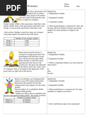 PDF Name: Simpsons Variables Worksheet Period: Date - Commack Schools Simpsons Variables Worksheet . Period: Date: Smithers thinks that a special juice will increase the productivity of workers. He creates three groups of 50 workers each and assigns each group the same task, to staple sets of papers. Group 1 drinks 100mL of the special juice while they work.