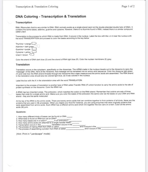 DNA Coloring Transcription and Translation - Biology LibreTexts Label the box with the x in it near the nucleus with the word TRANSCRIPTION and proceed to color the bases according to the key below. Color the strand of DNA dark blue (D) and the strand of RNA light blue (R). Color the nuclear membrane (E) gray. Translation Translation occurs in the cytoplasm, specifically on the ribosomes.