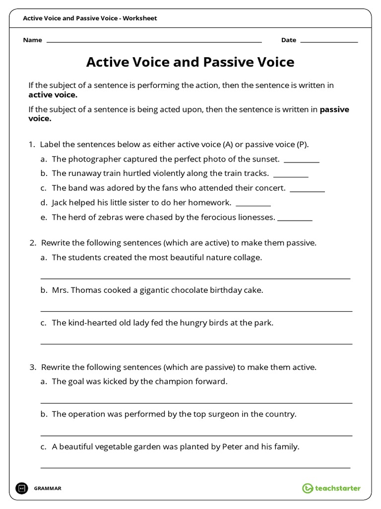 Active and Passive Voice Worksheet | Primary Resources - Twinkl In all three versions of this active and passive voice worksheet, pupils are asked to annotate a passive sentence to explain why it is passive. They are then given a selection of active sentences that they must rewrite in its passive form. For example, 'The year 6 children run a tuck shop' would become 'A tuck shop is run by year 6 children'.These active to passive voice ...