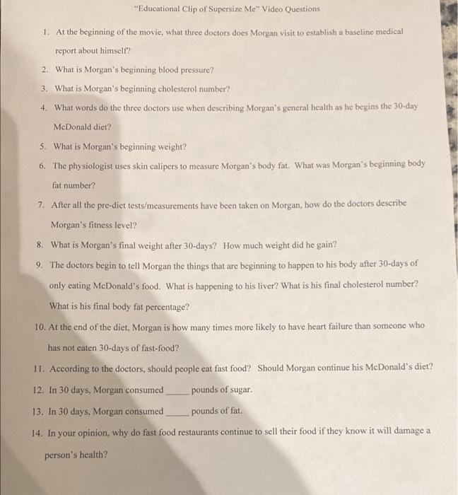 Supersize Me Questions.docx - Supersize Me Questions Answer each of the ... Supersize Me Questions Answer each of the following questions about the movie Supersize Me. 1. In general, what was Morgan's health status at the start of the project? Healthy Healthy At the end? Very unhealthy Very unhealthy 2. Why did Morgan make several doctors' visits before he started this project?