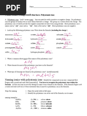 Nomenclature worksheet 1 monatomic ions answers. Atomic Structure Worksheet Answer Key / Http Kimscience … VerkkoName or write the formula for the following polyatomic ions sulfate CO3 2-nitrite MnO3 1-perphosphate SO5 2-hypoiodite BrO2 1-chlorite CO4 2-phosphite PO5 3-percarbonate ClO1-bromate IO2 1-hyposulfite PO4 3-permanganate NO2 1-carbonite SO4 2-2.Naming pogil answer ionic key polyatomic ions worksheet chemistry worksheets ion ap … Answers To Monatomic Ions Worksheets - Learny Kids Displaying top 8 worksheets found for - Answers To Monatomic Ions. Some of the worksheets for this concept are Polyatomic ionic formulas work answers pdf, Monatomic ions answers, Ions work answers, Monatomic ions answers, Ions work answer key, Polyatomic ions work answers pogil, Monatomic ions packet answers, Polyatomic ions work answers pogil. PDF Nomenclature Worksheet 1: Monatomic Ions - Honors Chemistry Nomenclature Worksheet 1: Monatomic Ions Use a periodic table to complete the table below: Element Name Element Symbol Ion Name Ion Formula 1. sodium 2. bromine 3. magnesium 4. chlorine 5. oxygen 6. boron 7. lithium 8. neon 9. phosphorus 10. aluminum 11. calcium 12. iodine Webnames-and-formulas-for-ionic-compounds-worksheet-answers … VerkkoThis is from the main group elements 1A-8A Ex) Na+1 ; Cl-1 Multiple-Cation Metal Transition metals Group B (sub shells D & F) form ions with multiple charges Ex.) Iron= Fe+1, Fe+2, Fe+3 Systematic Names A.K.A.Compounds with Transition Metals: Formula Writing When we have a metal and a non-metal we have an ionic compound.